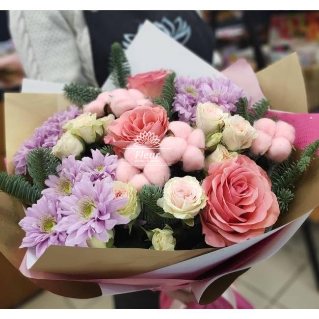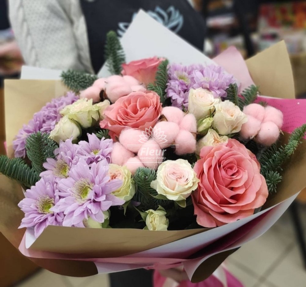 Описание Нежное сочетание розы, кустовой хризантемы , пионовидной кустовой розы и хлопка приведет в восторг любого обладателя