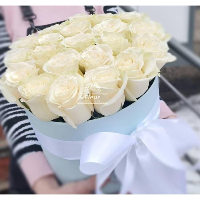 Описание 21 бело-ванильная сортовая роза в нежном аквабоксе